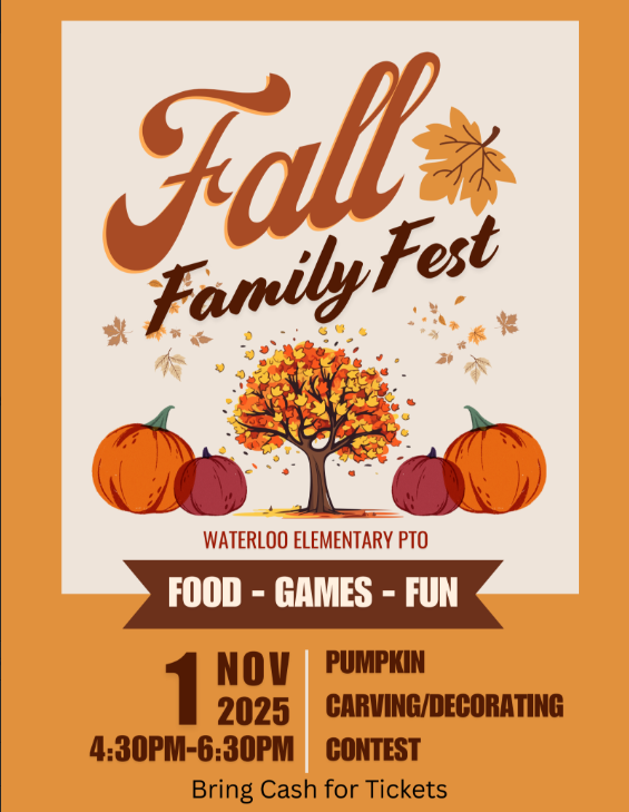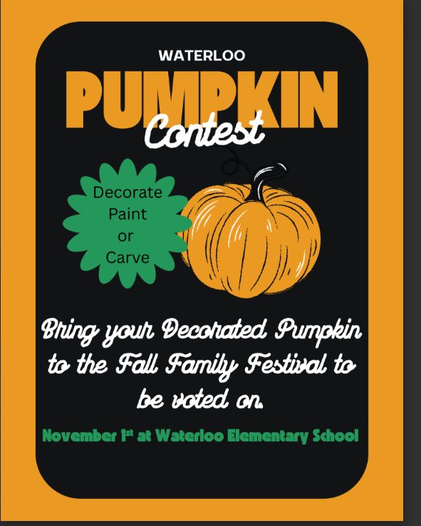 The Waterloo Weekly is posted! LOTS going on! As you see below, the PTO is hosting a Fall Family Festival on Saturday 11/1 from 4:30-6:30 at the school. There is a pumpkin decorating contest for families that wish to participate, food, games, etc! This is a fundraiser, with tickets available to purchase to do participate in some of the items.